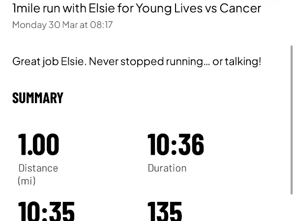 Elsie is taking on the Kids' Spring Challenge for Young Lives vs Cancer, to run one mile every day for two weeks (2 on some days as won’t be running on Sundays).